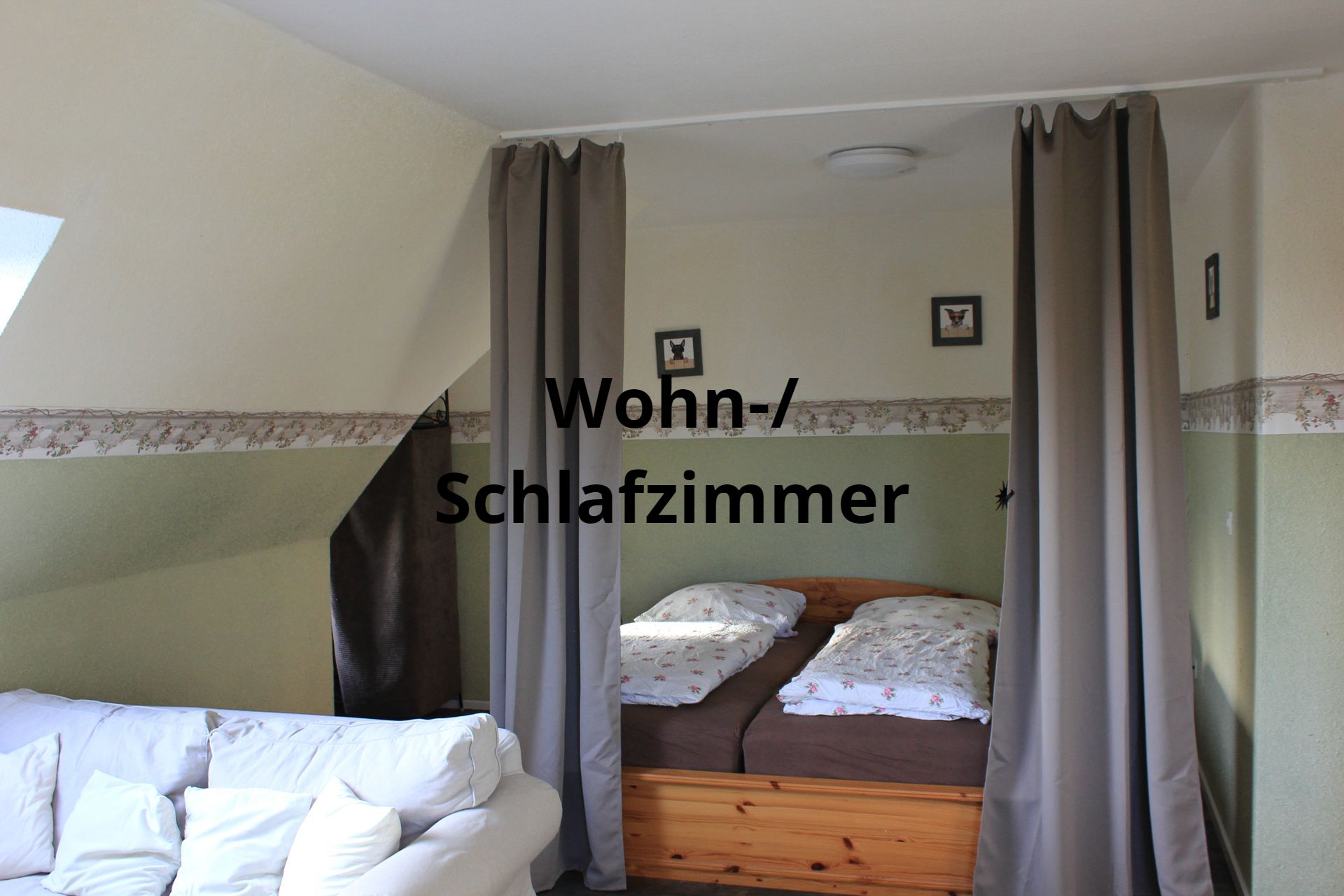 Im Flur befindet sich eine Garderobe. Die Wohnung verfügt über ein Badezimmer mit Dusche und WC, ein Schlafzimmer mit 2 Einzelbetten, eine voll ausgestattete Küche. Im kombinierten Wohn-/Schlafraum befindet sich die Essecke, Sat-TV, Sofa und hinter einem Vorhang ein Doppelbett.